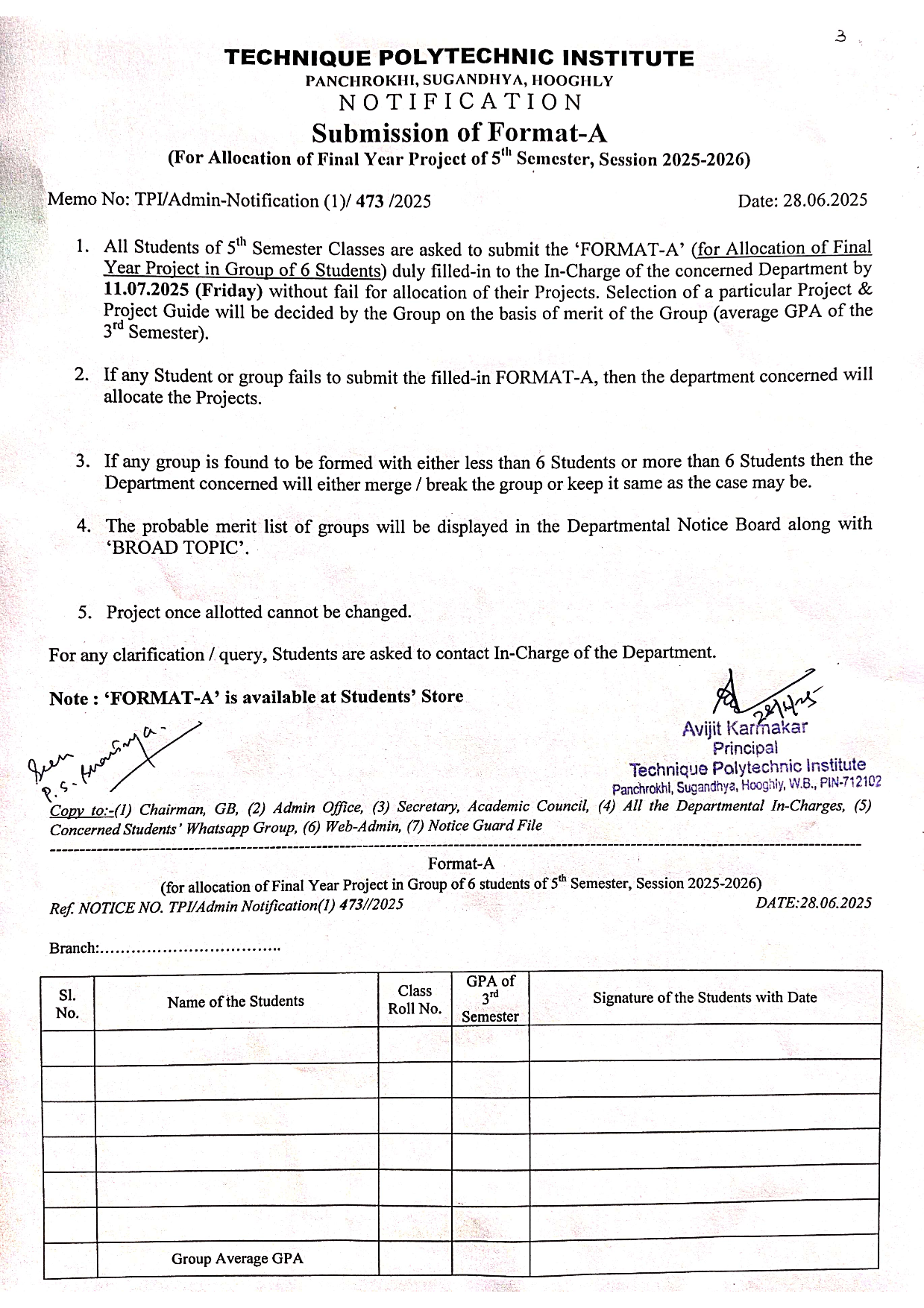NOTICE FOR NAME SUBMISSION OF FINAL YEAR PROJECT WITH FORMAT A