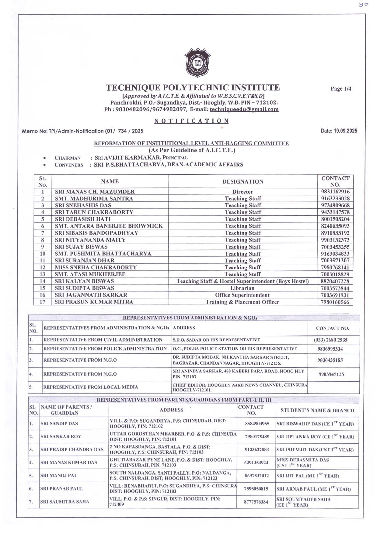 FORMATION OF ANTI RAGGING COMMITTEE