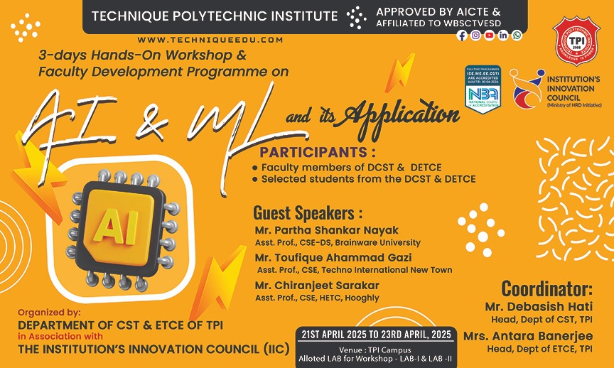 3 DAYS OFFLINE FACULTY DEVELOPMENT PROGRAMME & HANDS ON WORKSHOP ON AI & ML AND ITS APPLICATIONS[21.4.2025 to 23.04.2025]